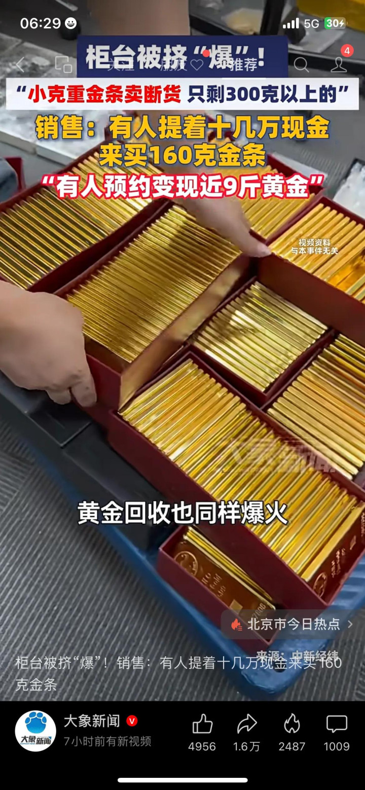 2025年12月29日,北京朝阳某金店的柜员对着围满柜台的顾客反复喊着这句话。玻璃柜里原本码得整整齐齐的10克、20克小金条早已空空如也,只剩几百克的大克重金条孤零零摆在那里,而柜台外的人群依旧挤着往前凑,有人举着手机转账,有人直接掏出厚厚的现金,只为抢一根金条。